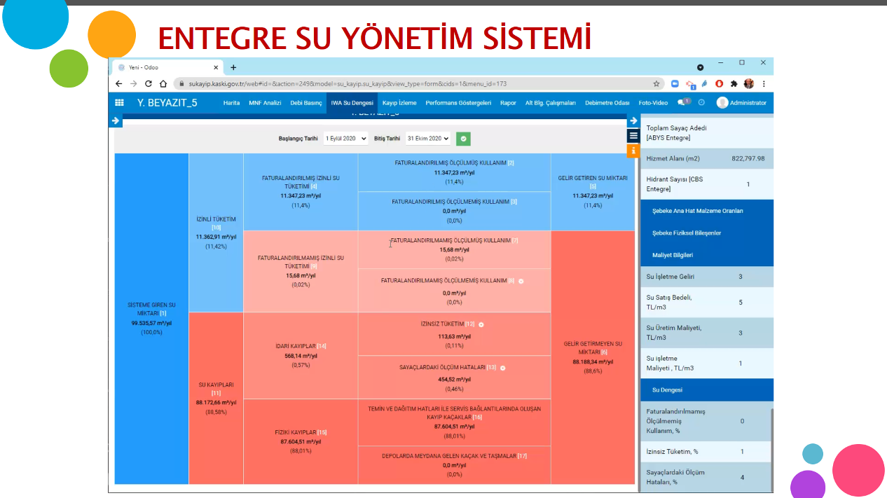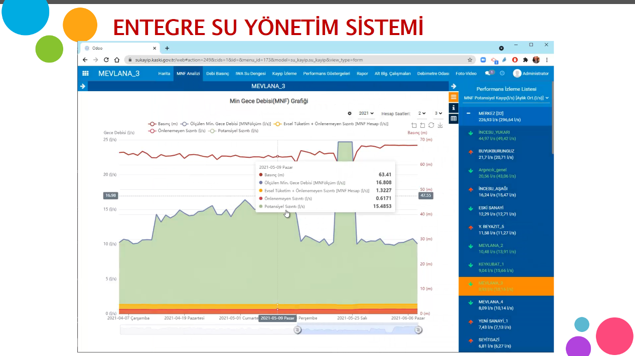 - Performans İzleme (Altyapı Sızıntı İndeksi - ILI, Gelir Getirmeyen Su - GGS, Arıza Sıklık İndeksi - ASİ, Kayıp İzleme - Aylık/Günlük)